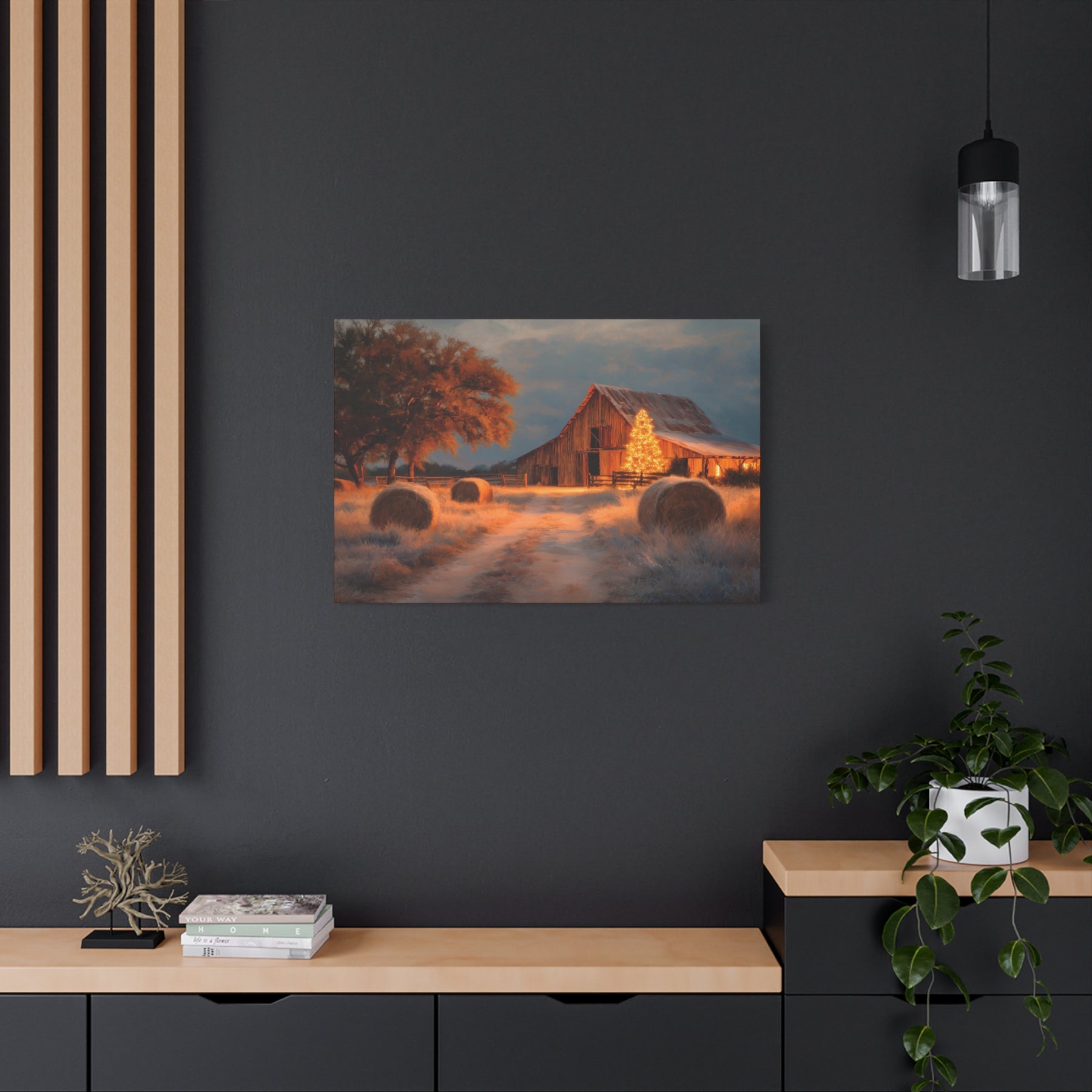 The night settles soft over the pasture, and the only sound is the hush of winter wind through the hay. A lone barn glows warm against the frost, its Christmas tree shining like a beacon in the stillness. It’s that kind of Texas evening — where peace feels close enough to touch.