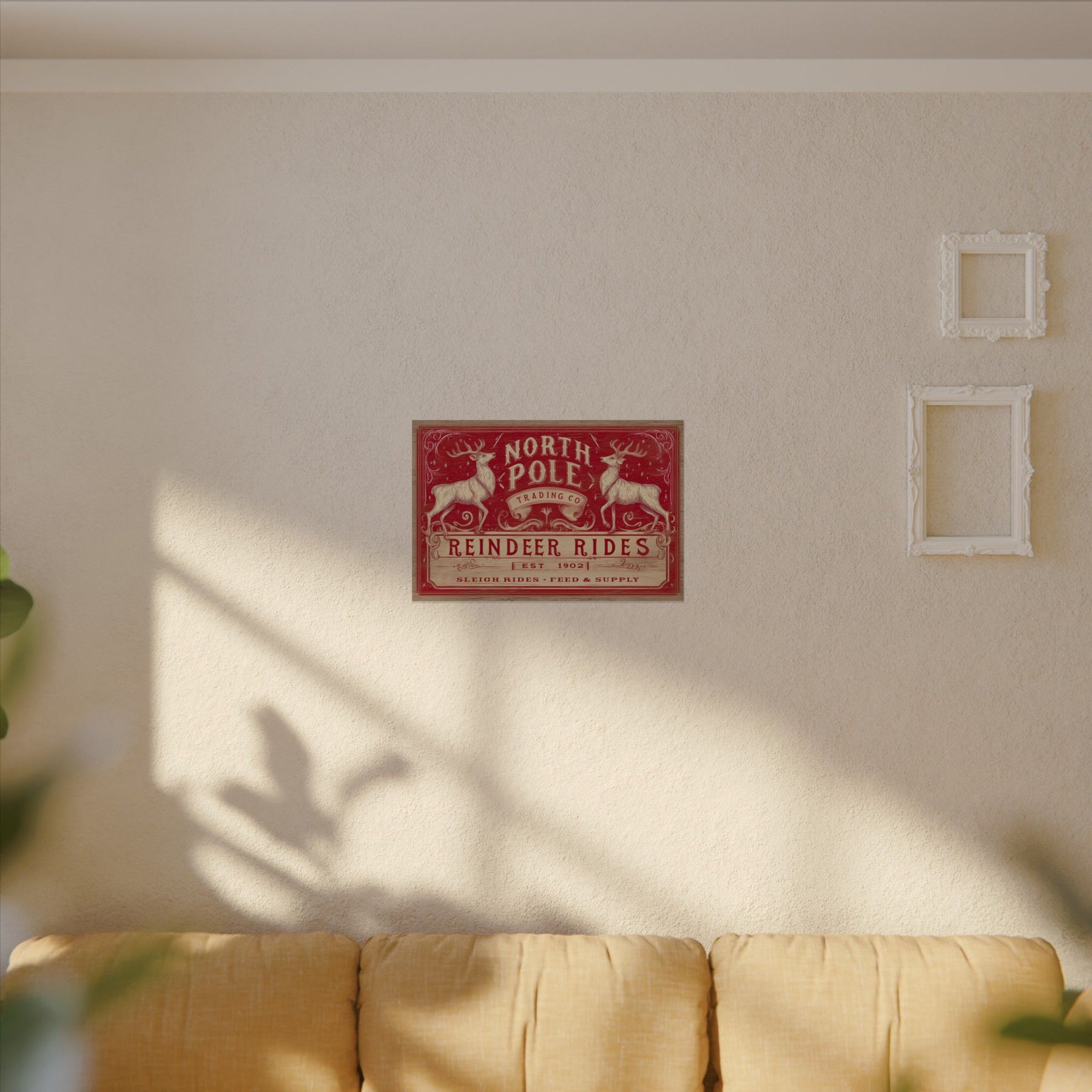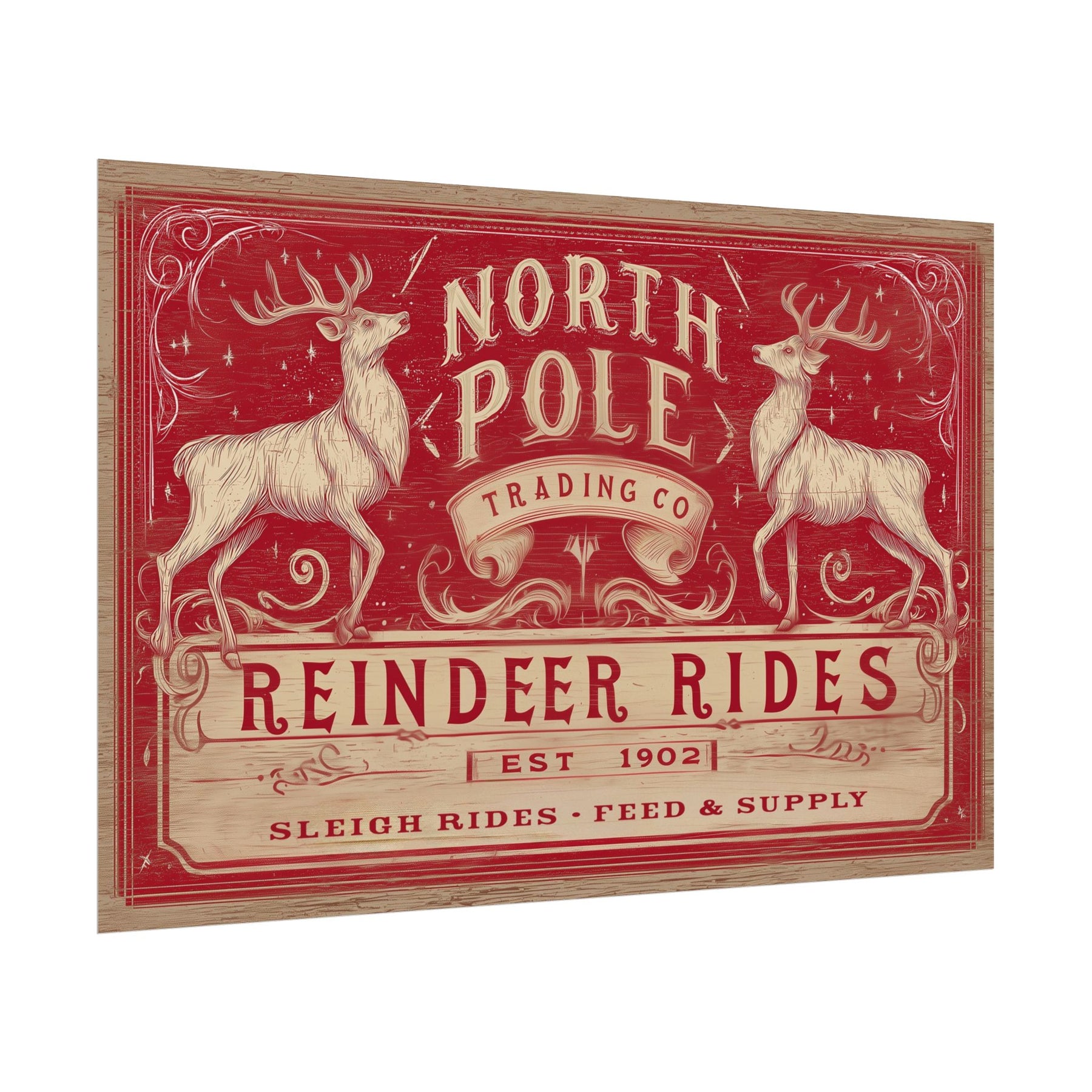 North Pole Trading Co. – Reindeer Rides brings a warm, vintage Western Christmas moment into your home — the kind of scene that feels pulled from an old ranch-town holiday postcard. Printed on textured watercolor matte paper, each piece has a soft, handcrafted feel that highlights every brushstroke and weathered detail.