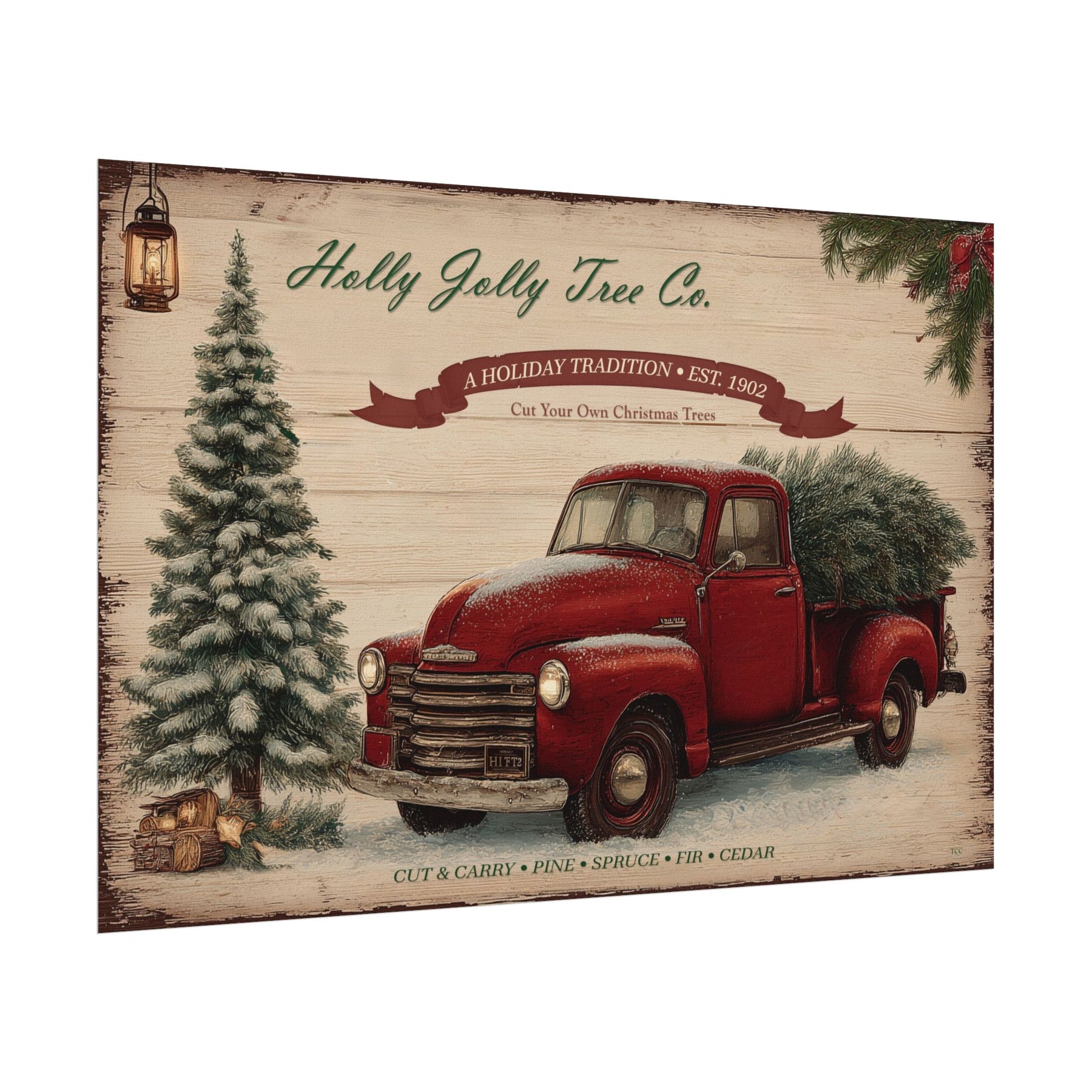 Step into the charm of a country Christmas with The Holly Jolly Tree Co. — a warm winter scene featuring a vintage red pickup stacked with freshly cut evergreens, glowing under soft snow and golden light. It’s the kind of holiday moment that brings back old traditions, quiet evenings, and that comforting Texas spirit we carry into every season.