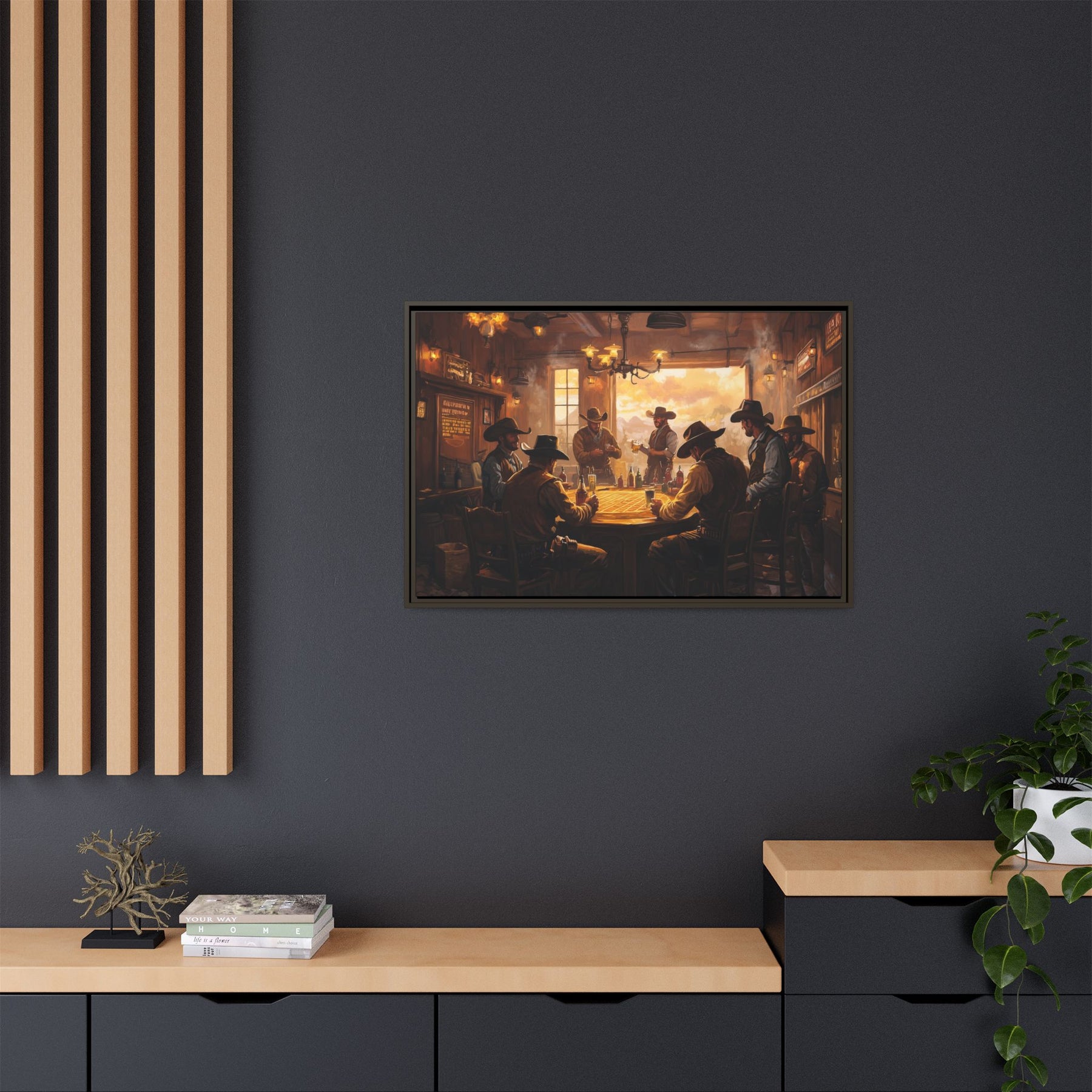 Cards and Cowboys captures a classic saloon moment — the grit, the laughs, and the tension that hangs between every hand of poker. Bottles clink, lanterns glow, and the dust of the trail gives way to smoky air and hard-earned stories. Golden-hour sun pours through the windows, casting long shadows and long odds.