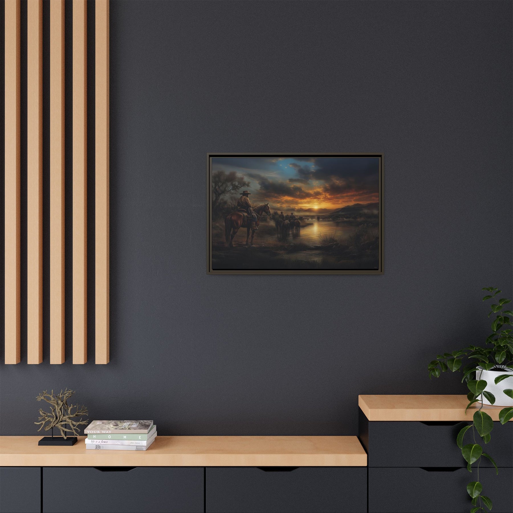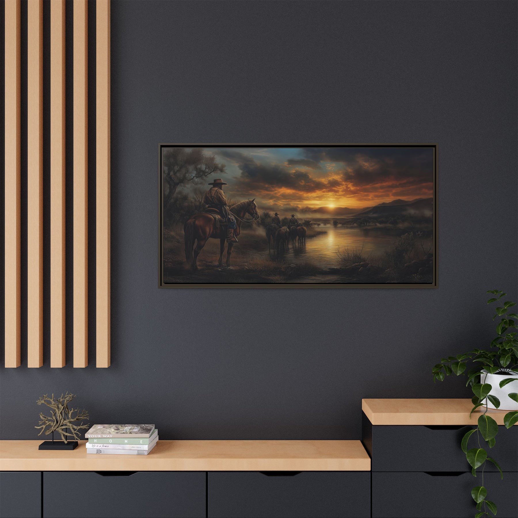 Bring home the timeless grit and golden-hour beauty of the Texas frontier with Stewards of the Lone Star Legacy — a powerful Western sunset canvas from the Western Artworks Collection, featuring a group of Texas Rangers riding steady along the riverbank.