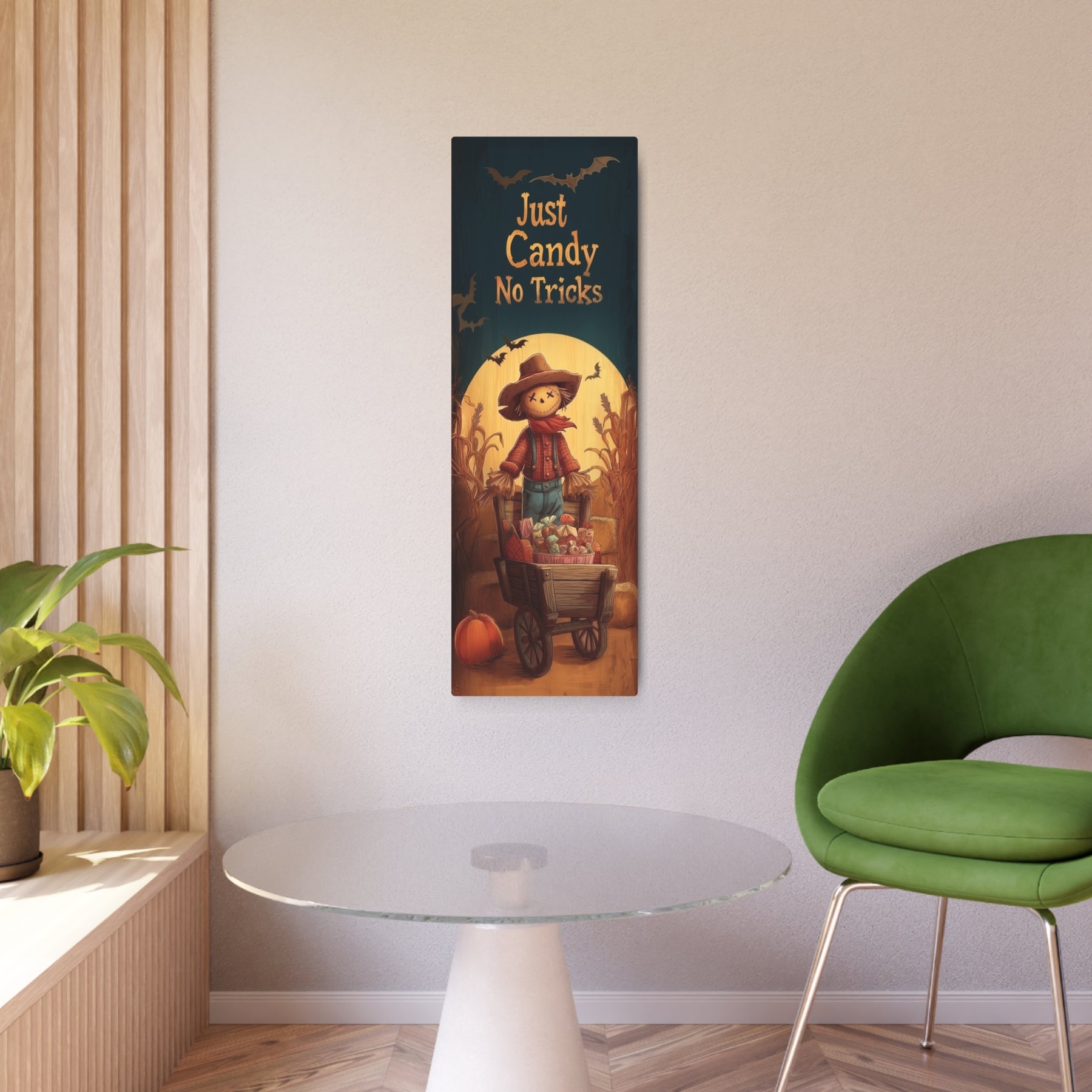 Skip the tricks and celebrate the sweetest part of Halloween. The Just Candy No Tricks metal sign features a stitched-smile scarecrow in cowboy hat and flannel, standing behind a wagon loaded with candy under a glowing harvest moon. Surrounded by hay bales, pumpkins, and swirling bats, it’s a playful Western twist on Halloween tradition.