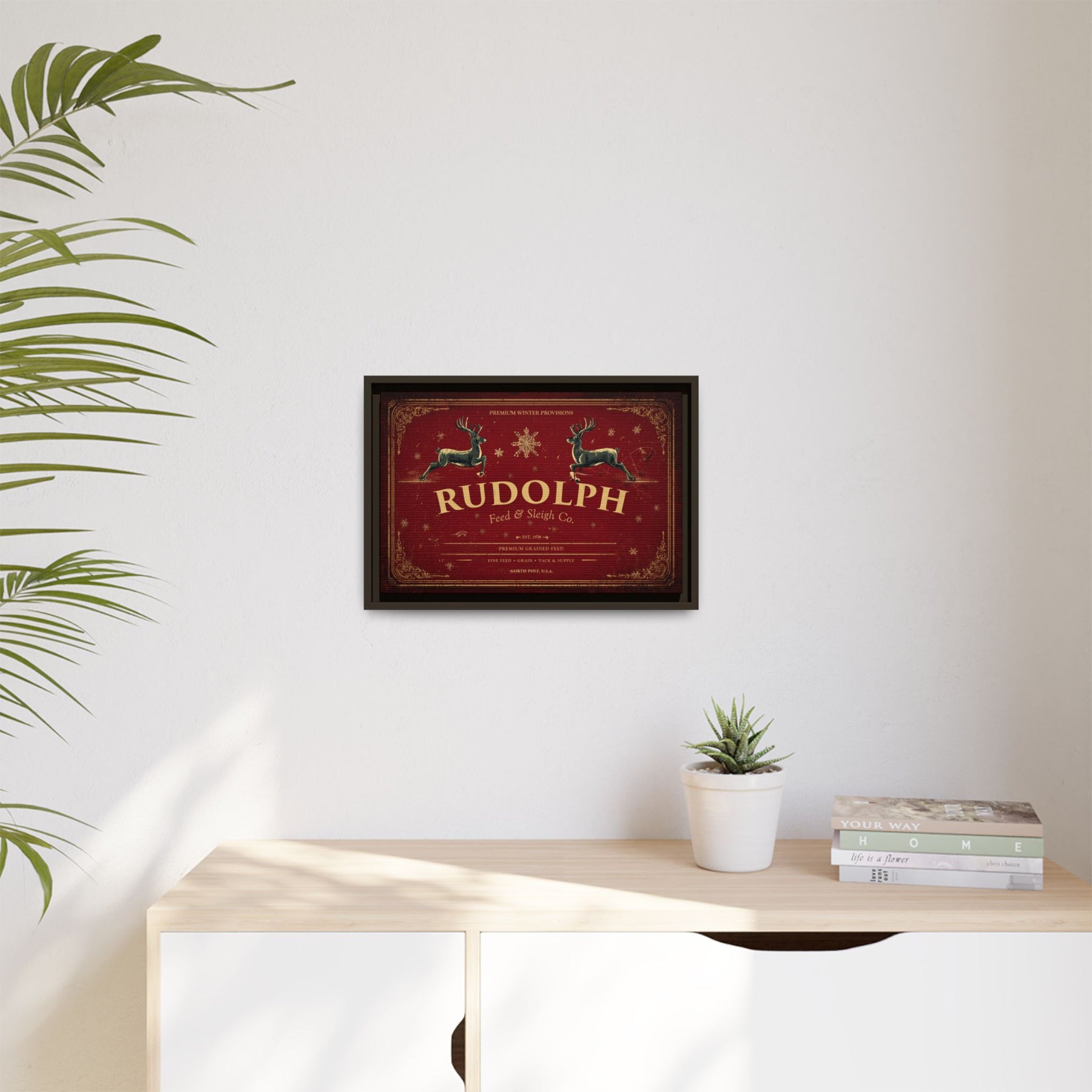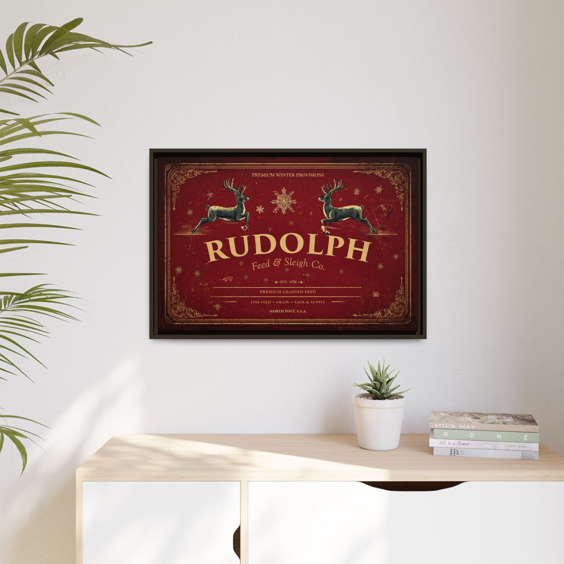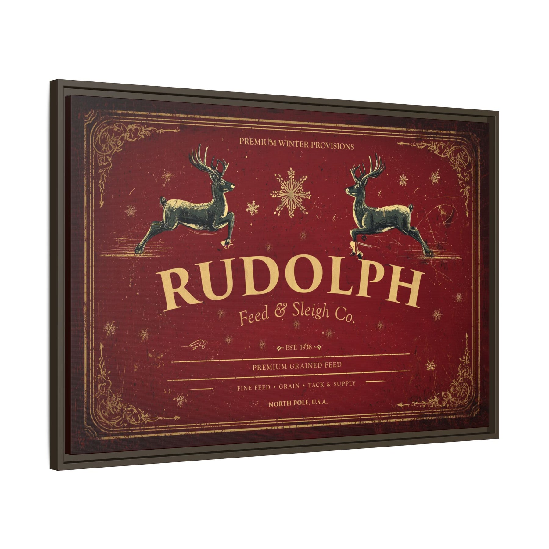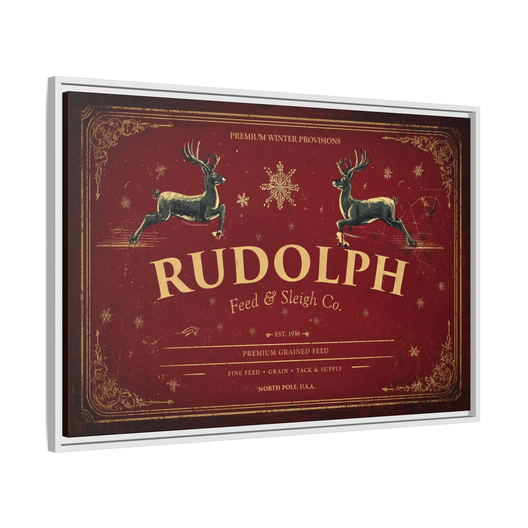 A tribute to the timeless magic of Christmas and the hardworking spirit of the season, Rudolph Feed & Sleigh Co. brings a nostalgic touch of North Pole tradition to your home. The deep red backdrop, classic typography, and galloping reindeer evoke the look of an old-time feed store sign — polished into fine art that belongs above the hearth or in any holiday gathering space.