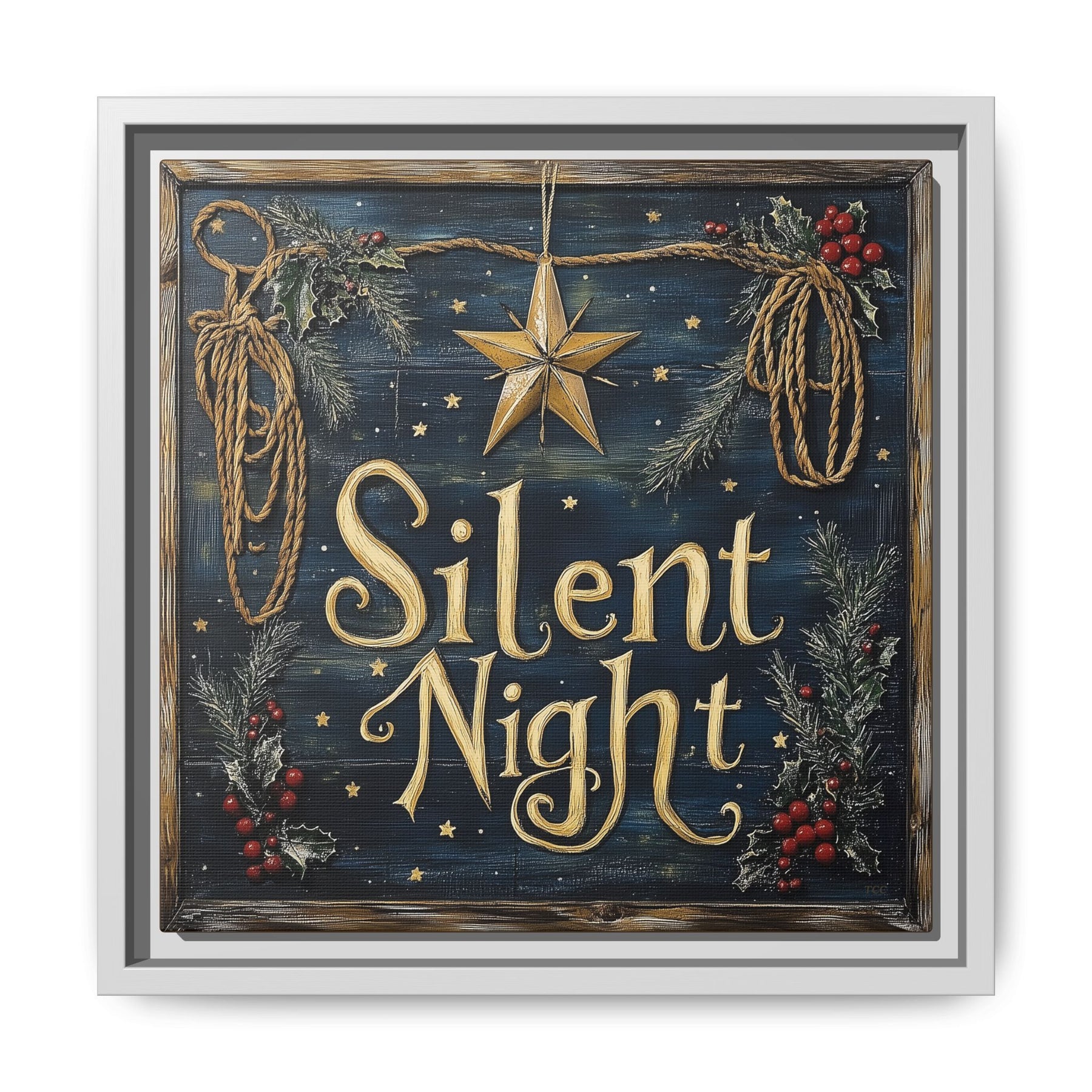 The calm of a starlit Christmas sky meets Western charm in Silent Night. Twined lassos, golden stars, and holly sprigs frame the words that capture the season’s quiet peace. With rich midnight tones and weathered brushwork, this canvas brings the warmth of cowboy country to your holiday home.