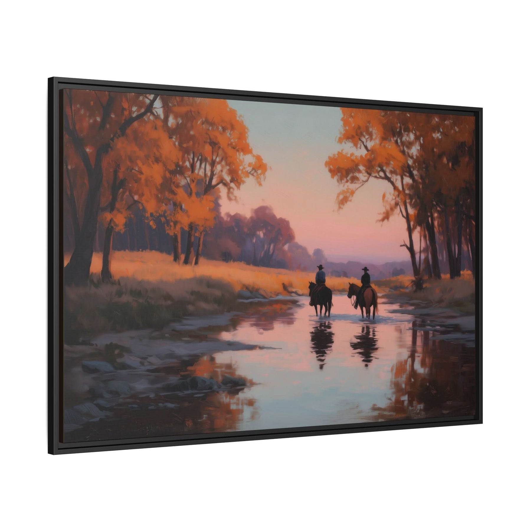 As the autumn sun sinks low, two riders guide their horses through a quiet creek, the last light of day settling softly across the land.