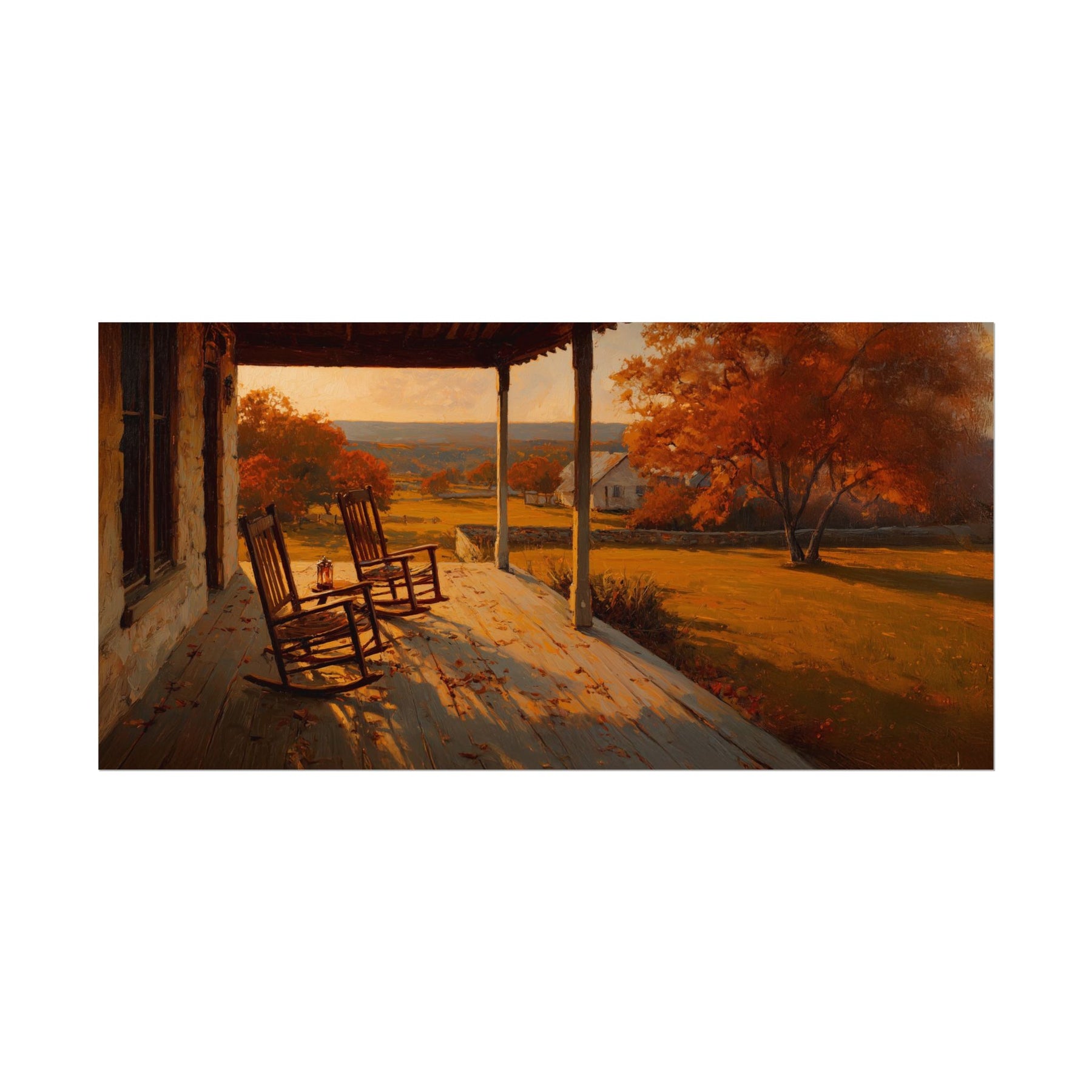 As the Texas Hill Country settles into evening, the last light drapes the land in gold. The porch stands quiet — rocking chairs still, lanterns glowing soft — while Spanish and Post Oaks catch the glow of autumn, their leaves shifting into warm amber against the rolling fields.