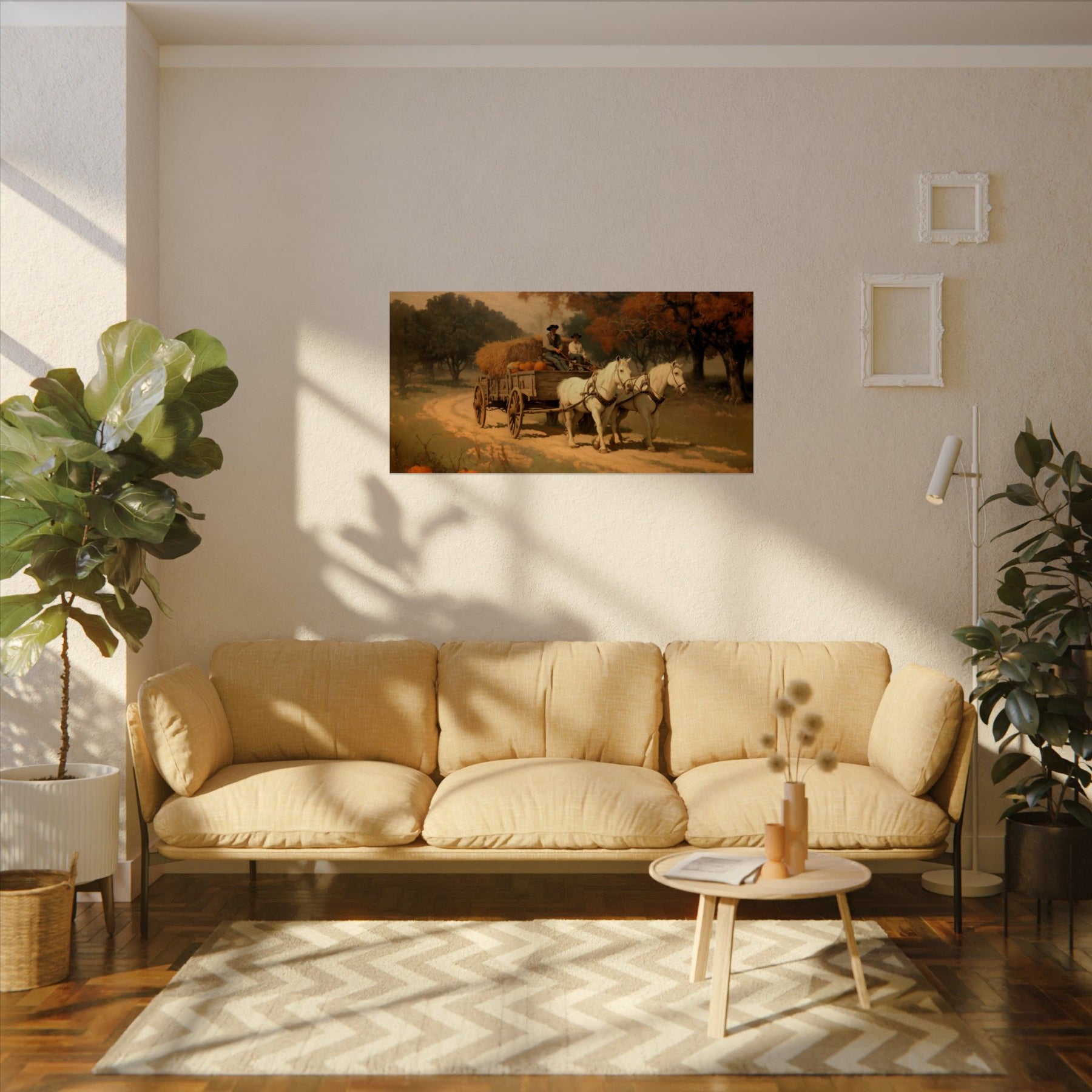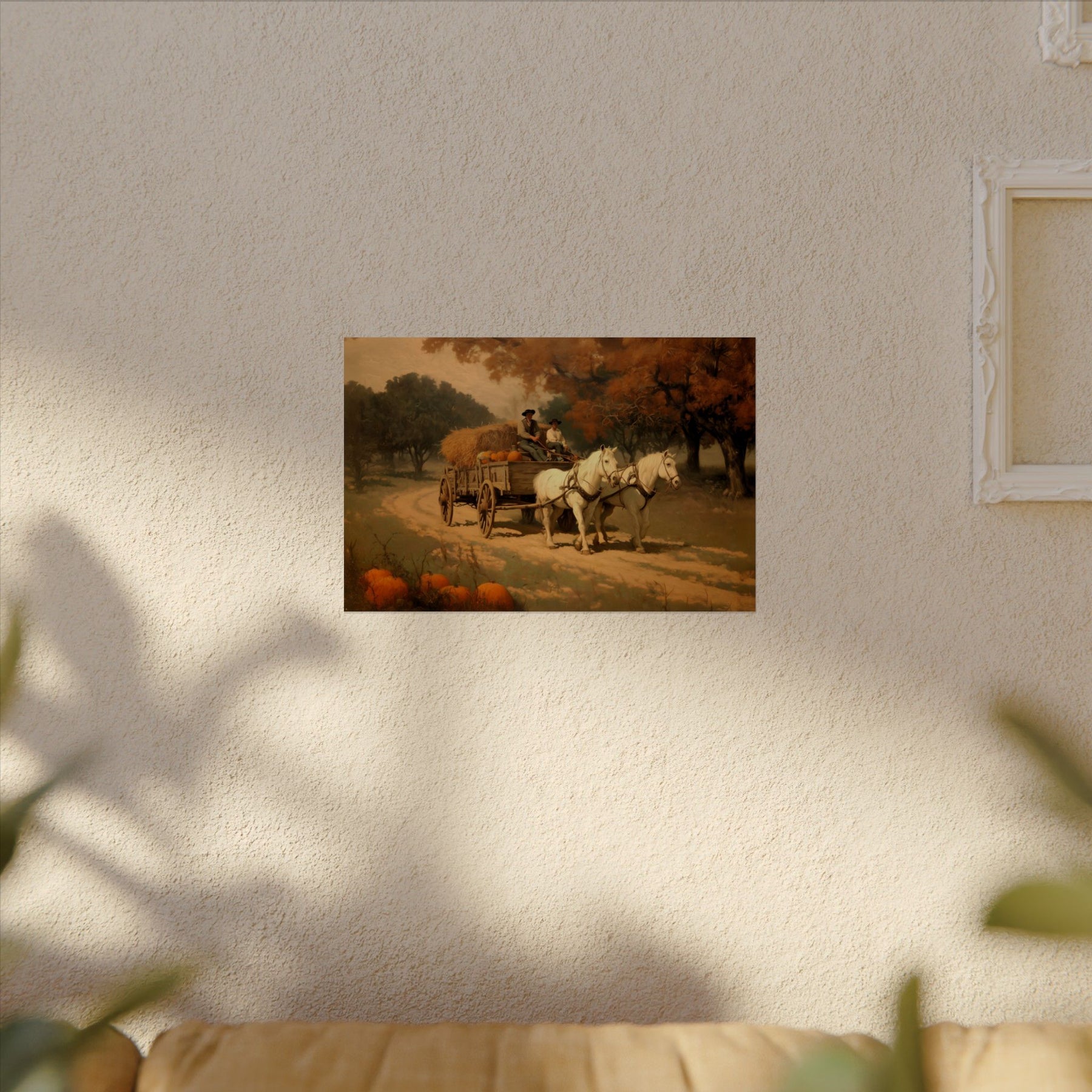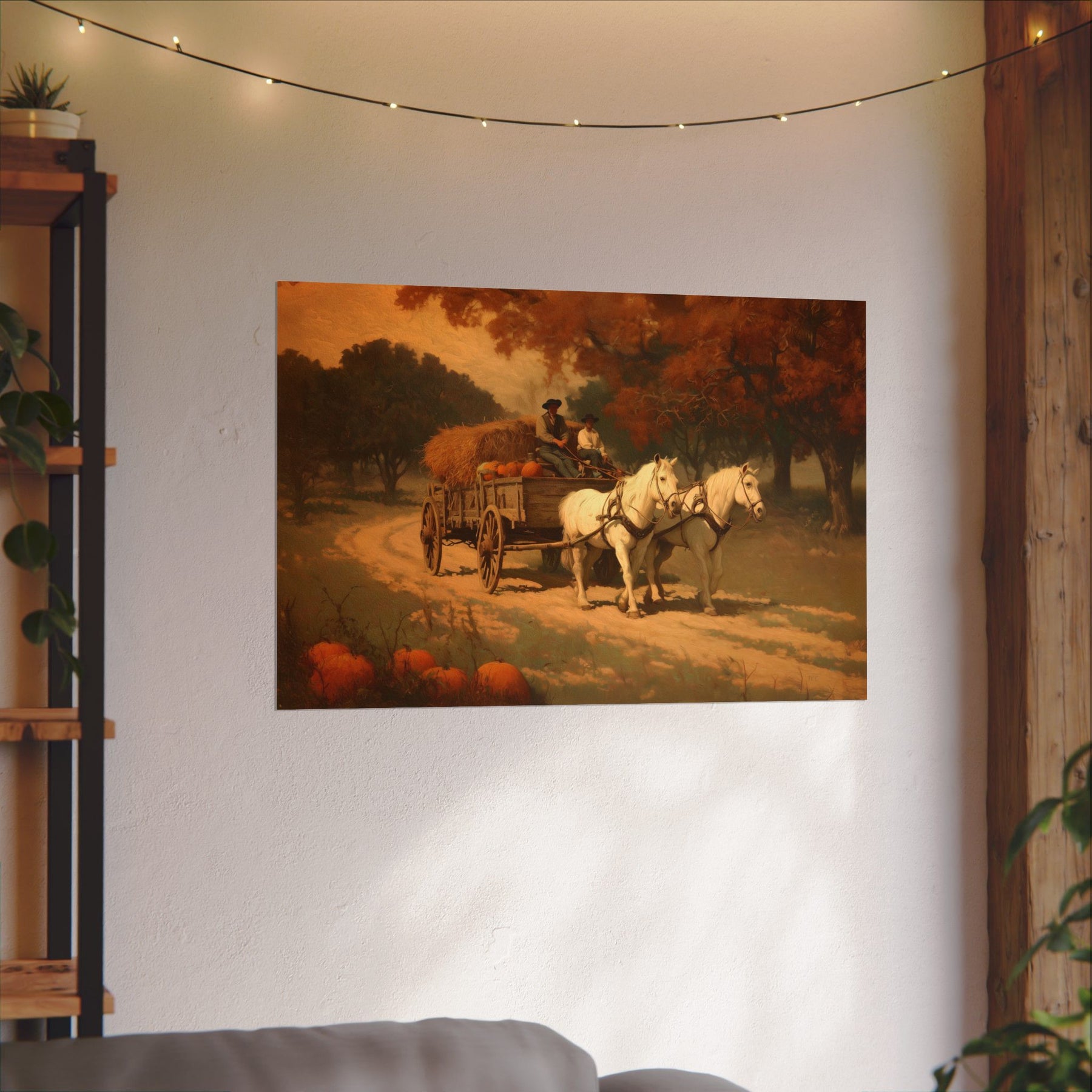 Two white horses pull a wagon stacked with pumpkins as a father and son ride through the quiet glow of fall. Fathers & Sons, Autumn Ride holds onto the rhythm of the season — when the land softens, daylight settles warm across the fields, and traditions pass between generations without a word spoken.