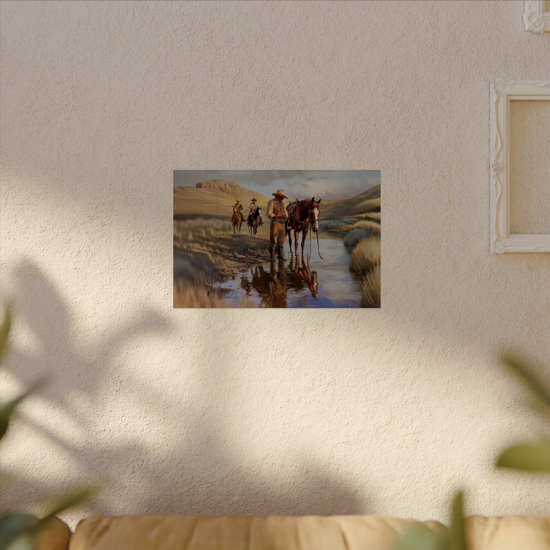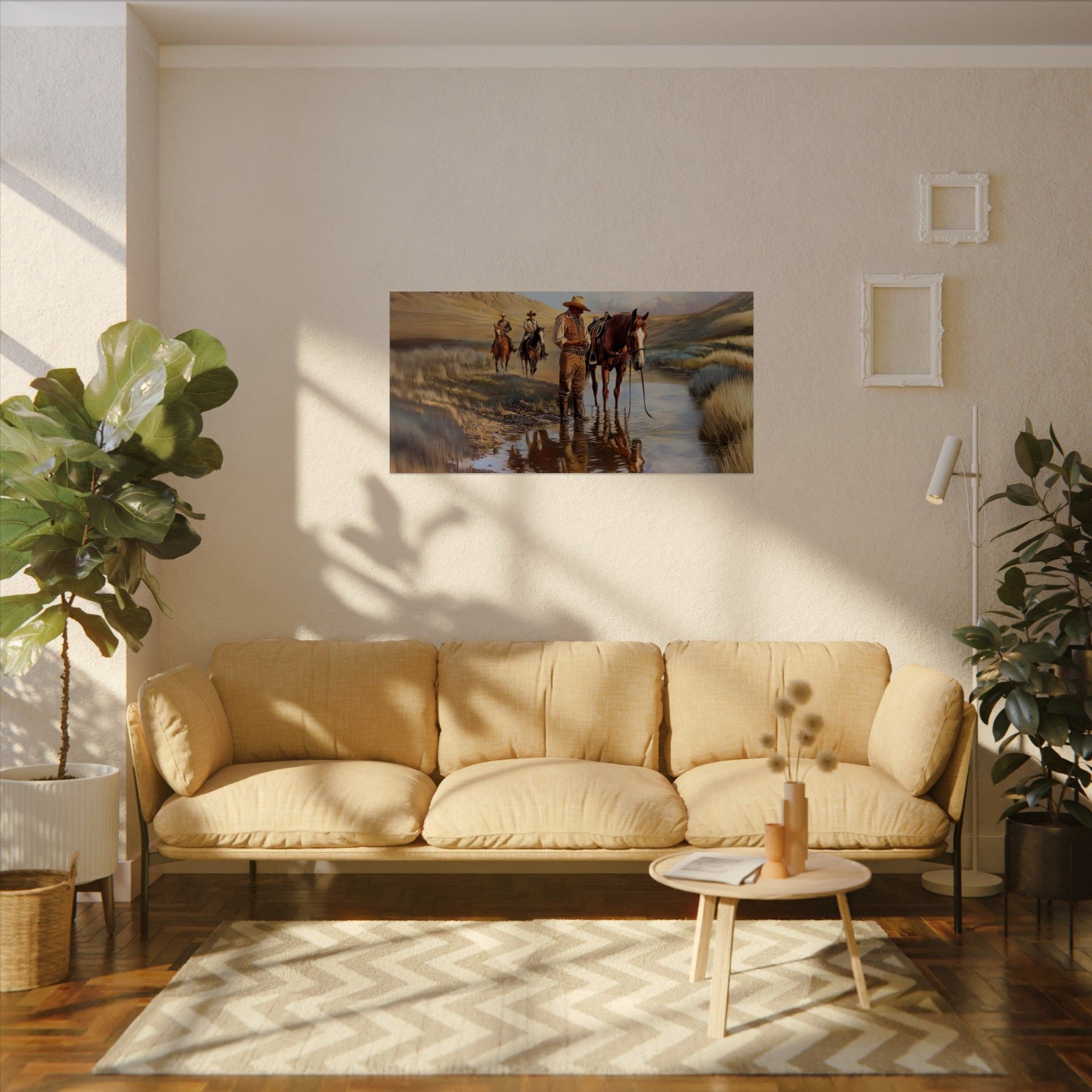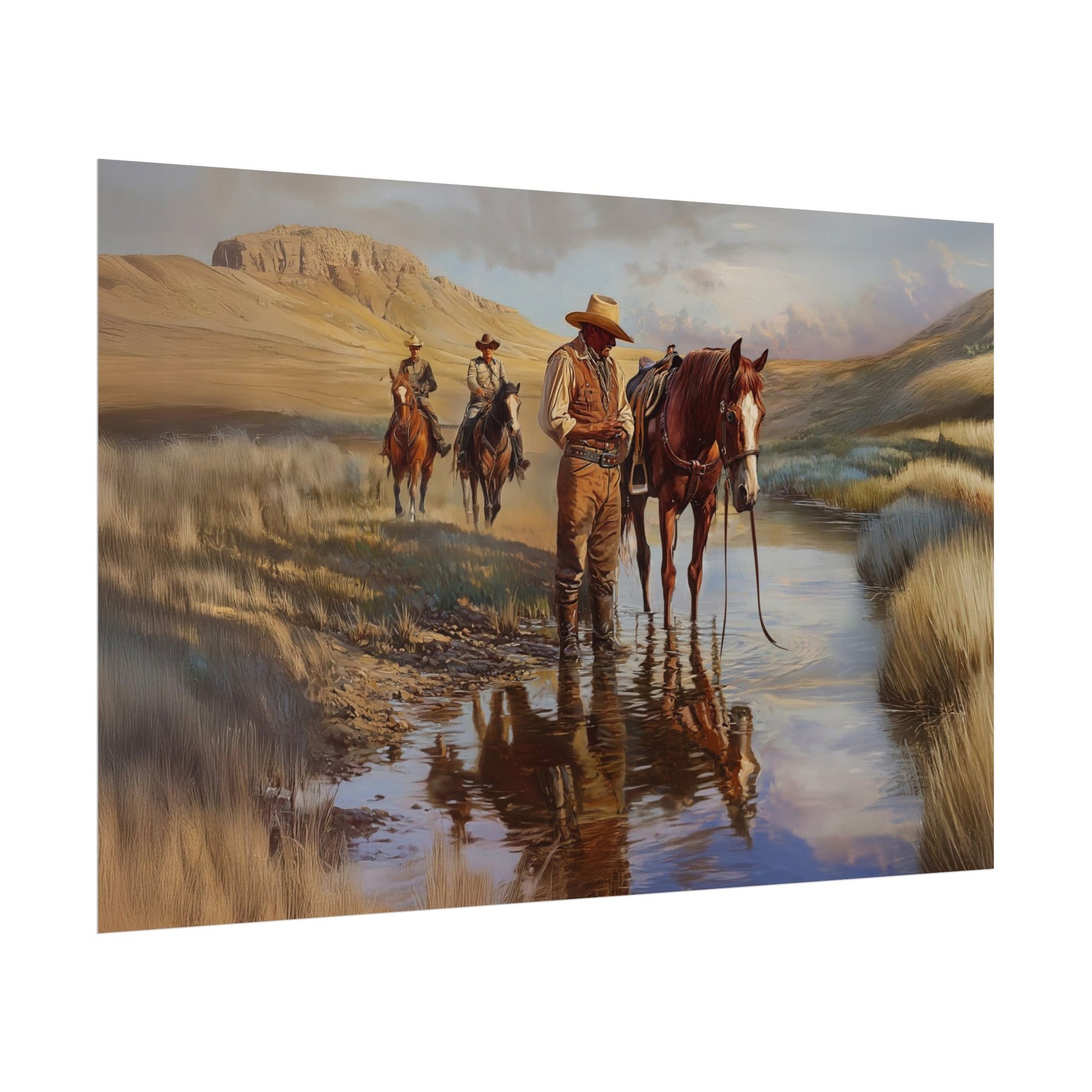 Lone Star Guardians captures a moment of quiet strength — Texas Rangers resting at the edge of a stream after a long day’s ride. The sun dips low over golden plains, casting a warm glow as dust settles and boots meet water. One Ranger stands in reflection, his horse at his side, while two more ride down the slope behind him — bonded by duty, distance, and trust. From the shimmer of the water to dusk’s final light, every detail honors the spirit of the Texas frontier.