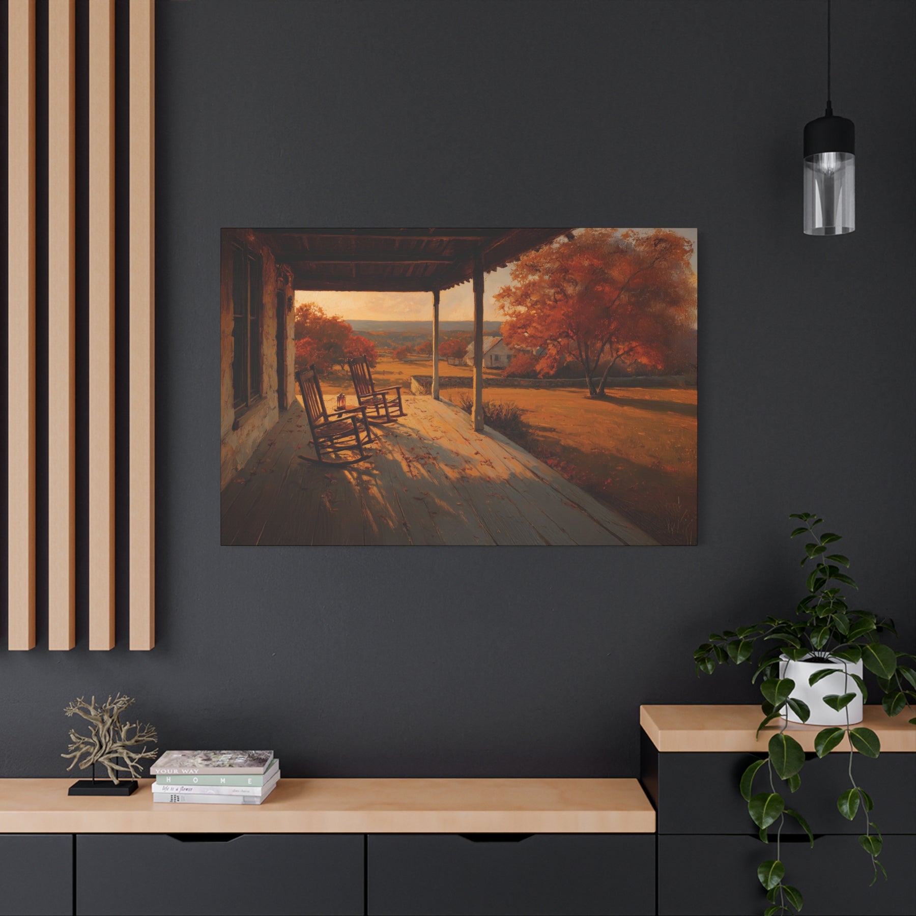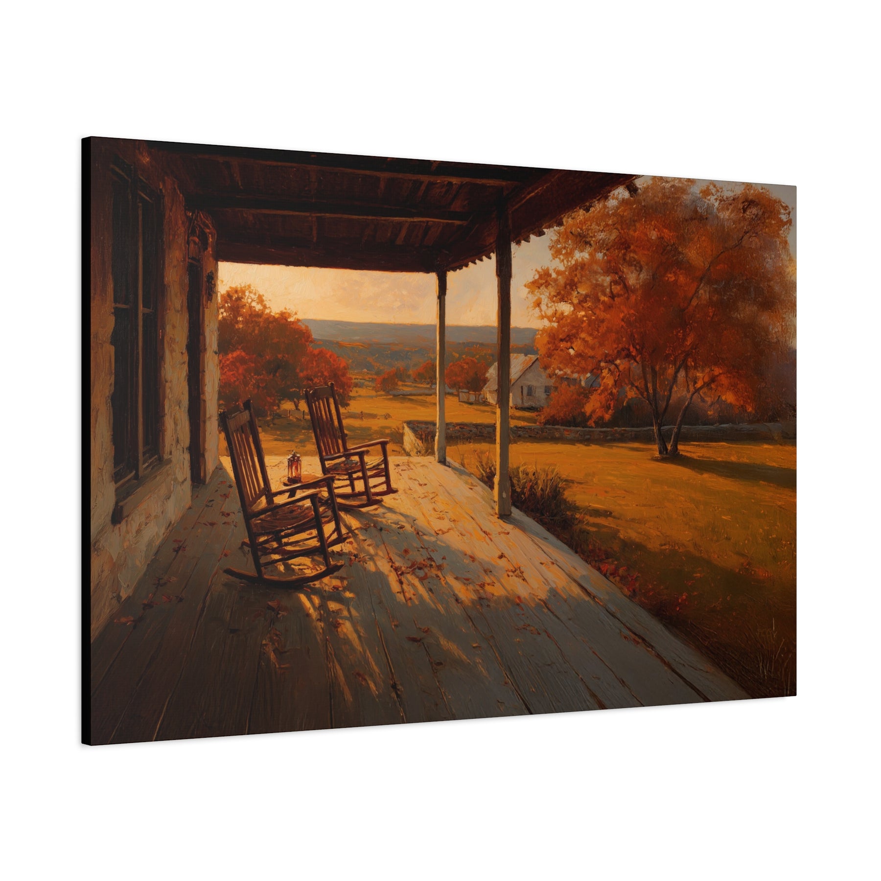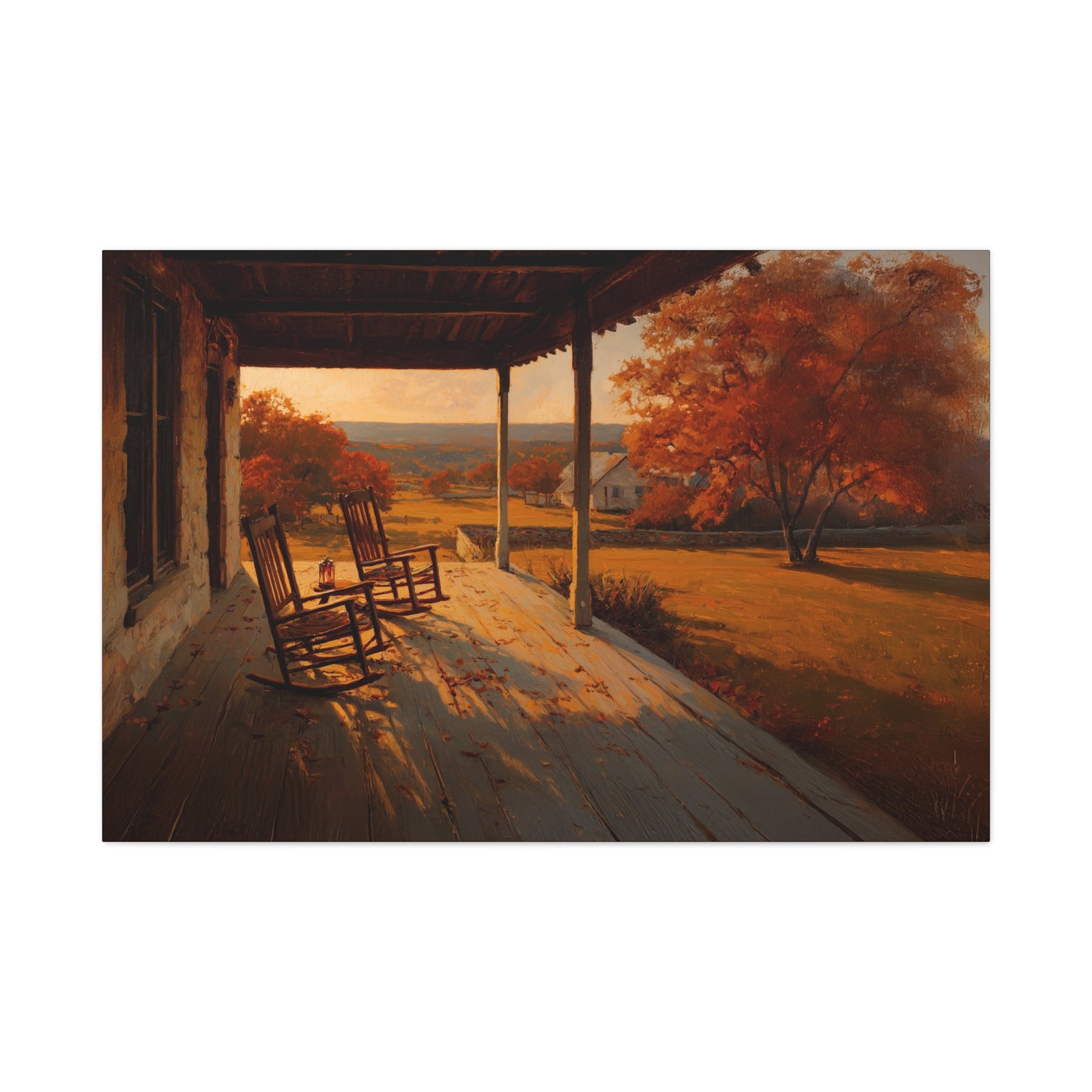 As the Texas Hill Country settles into evening, the last light drapes the land in gold. The porch stands quiet — rocking chairs still, lantern glowing soft — while Spanish and Post Oaks catch the glow of autumn, their leaves shifting into warm amber against the rolling fields.