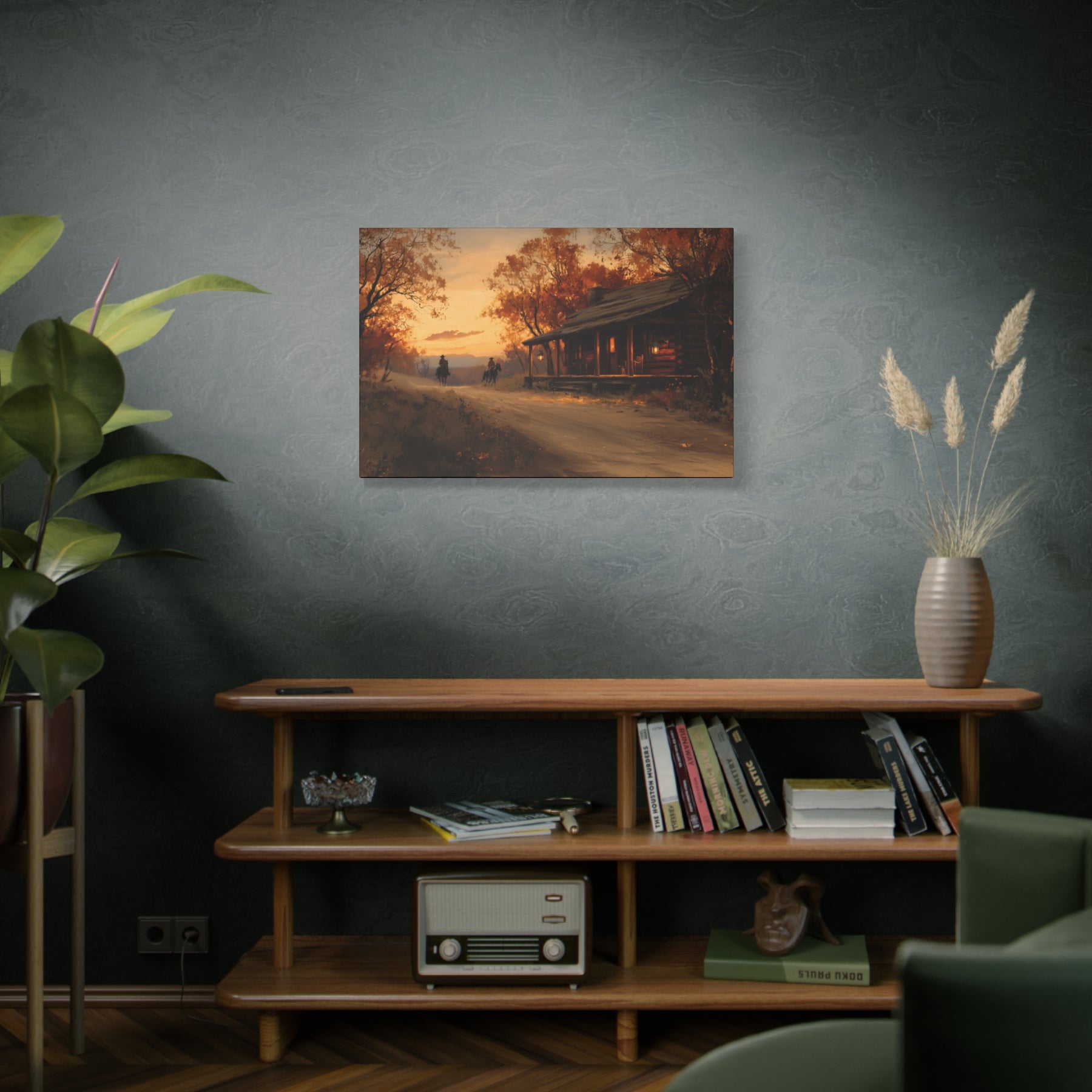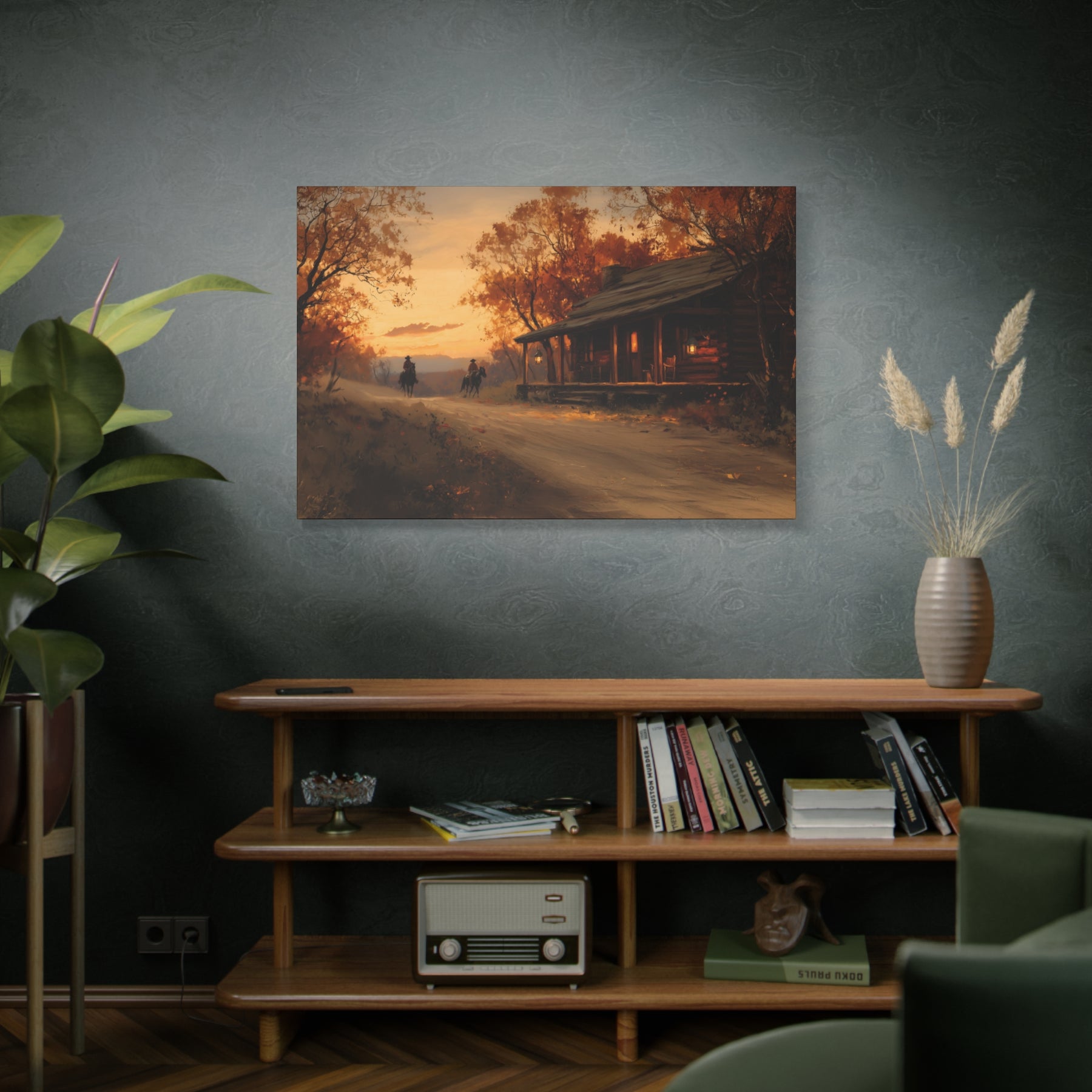 This artwork speaks to the comfort of belonging, the shelter of tradition, and the golden promise of autumn nights. From the weathered timbers of the cabin to the dust rising beneath the horses’ hooves, every detail holds a piece of western heritage.