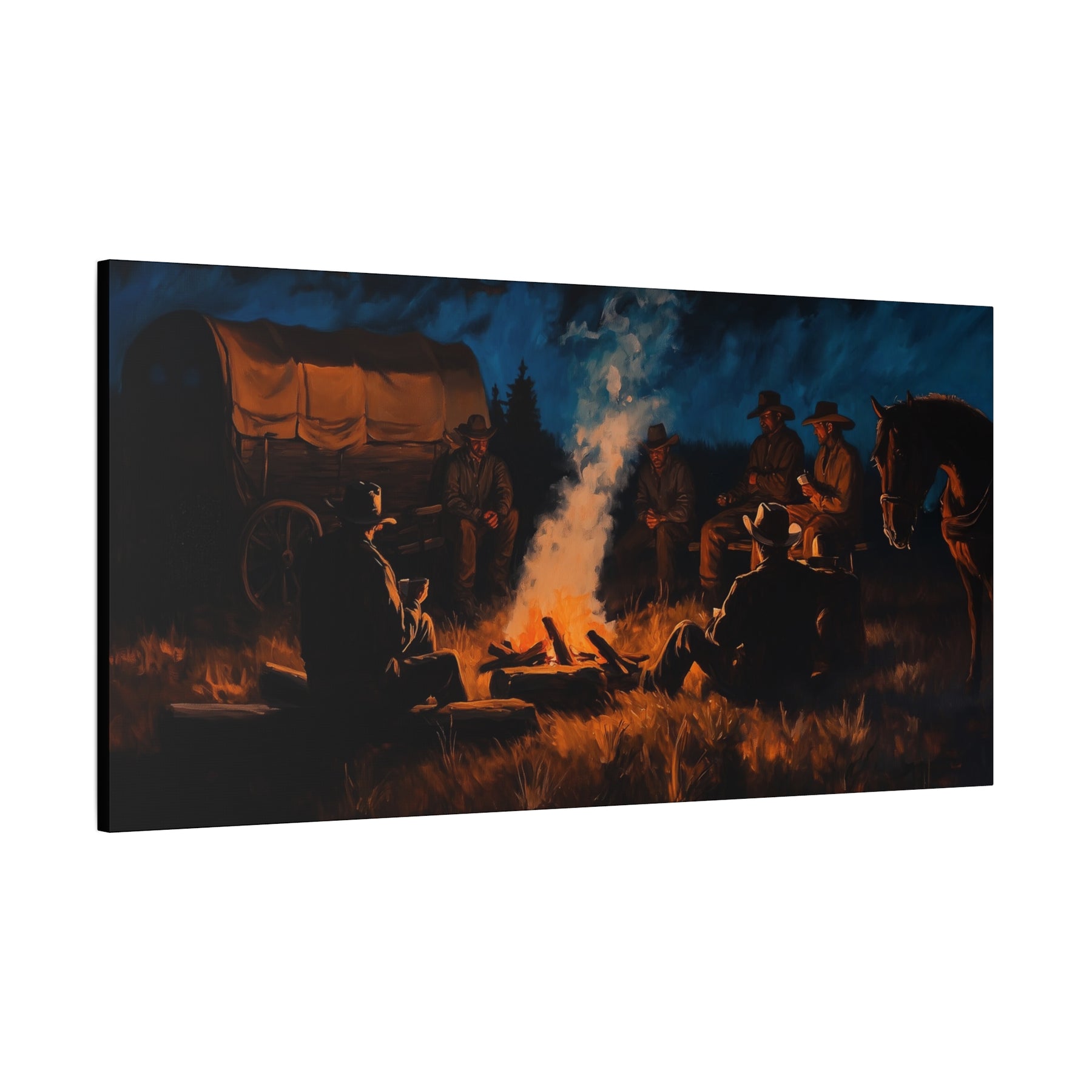 A lone horse stands watch, still and steady, while a covered wagon looms quietly in the background — a timeless silhouette on the open range. It’s a tribute to life lived hard, friendships forged on the trail, and the sacred calm that only a fire under the stars can bring.