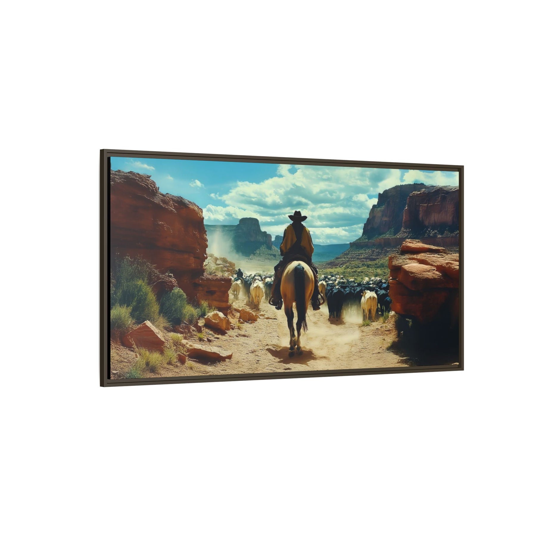 Canyon Drive: The Spirit of the West captures the raw motion and grit of a cowboy riding drag through a sunlit canyon — framed by towering red rock and steeped in golden light. It’s a tribute to the trail-driving spirit that shaped the American West: quiet strength, dust-covered tradition, and unshakable purpose.