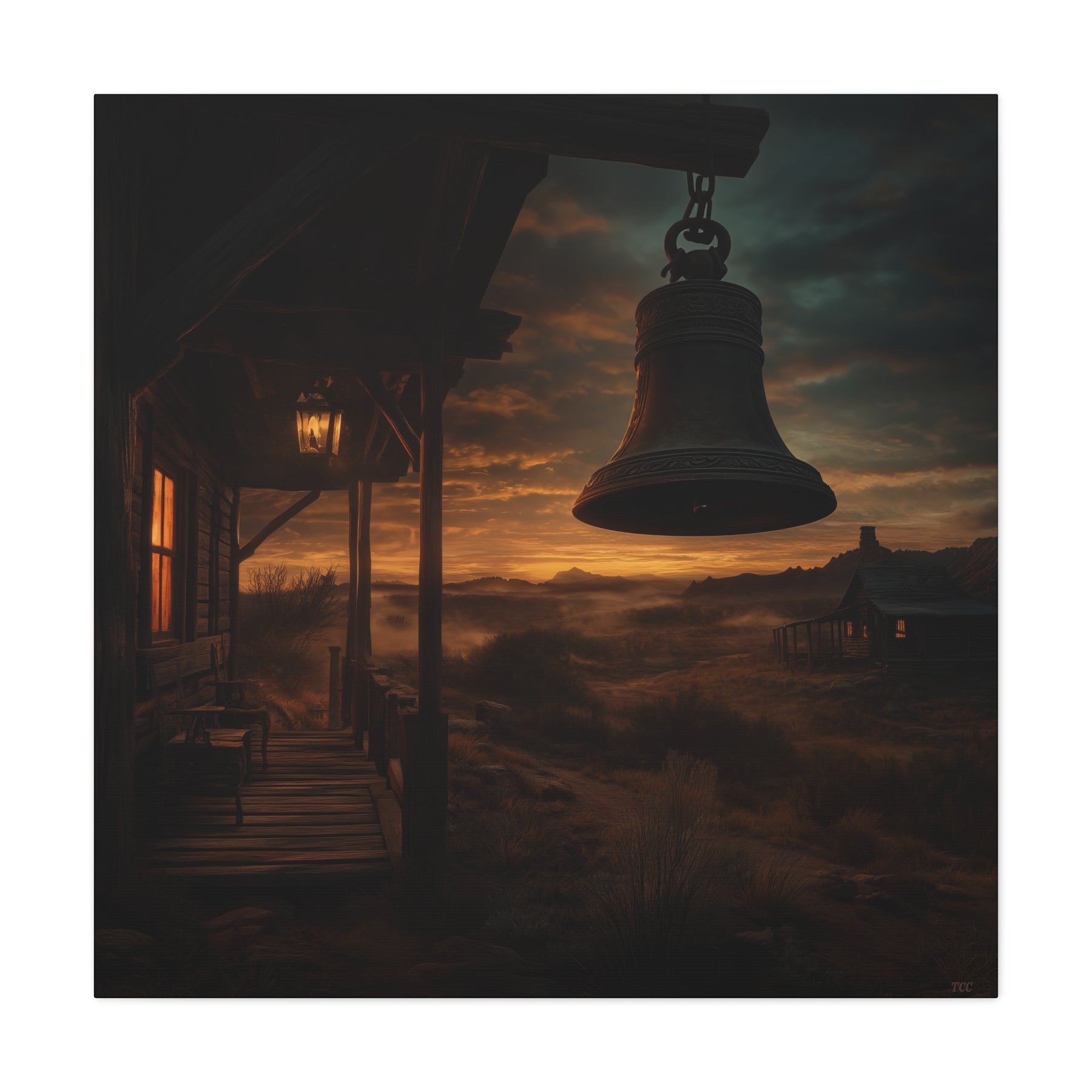 Dusk settles over the prairie. A lantern flickers. And the old bell above the trail hangs still — worn, silent, and full of stories.