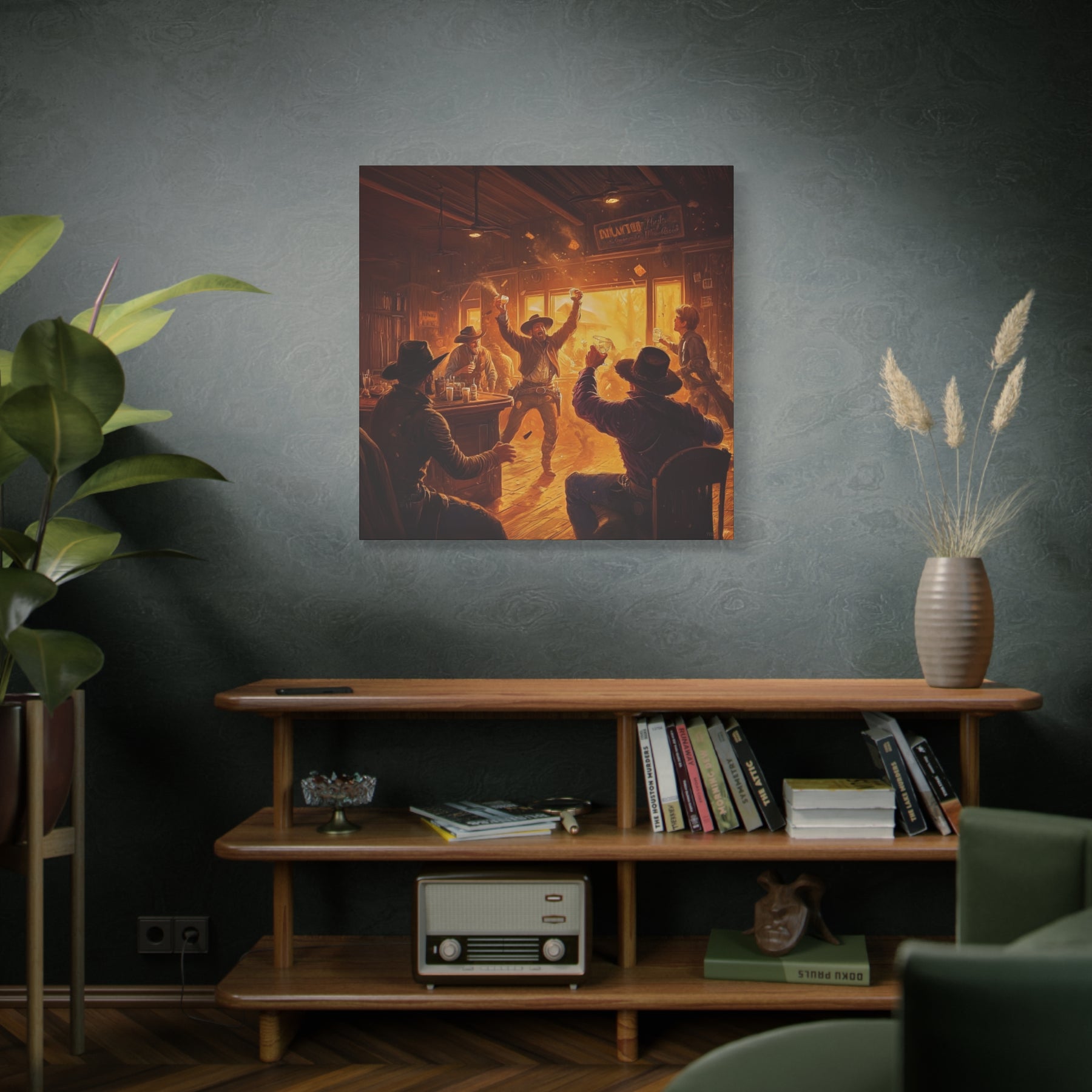This cinematic piece brings the rowdy heart of the Old West to life — with golden lantern light, weathered hats, and the shared grit of men who’ve seen the trail. It’s rowdy. It’s real. And it’s made to hang proud in any room that honors the cowboy spirit.