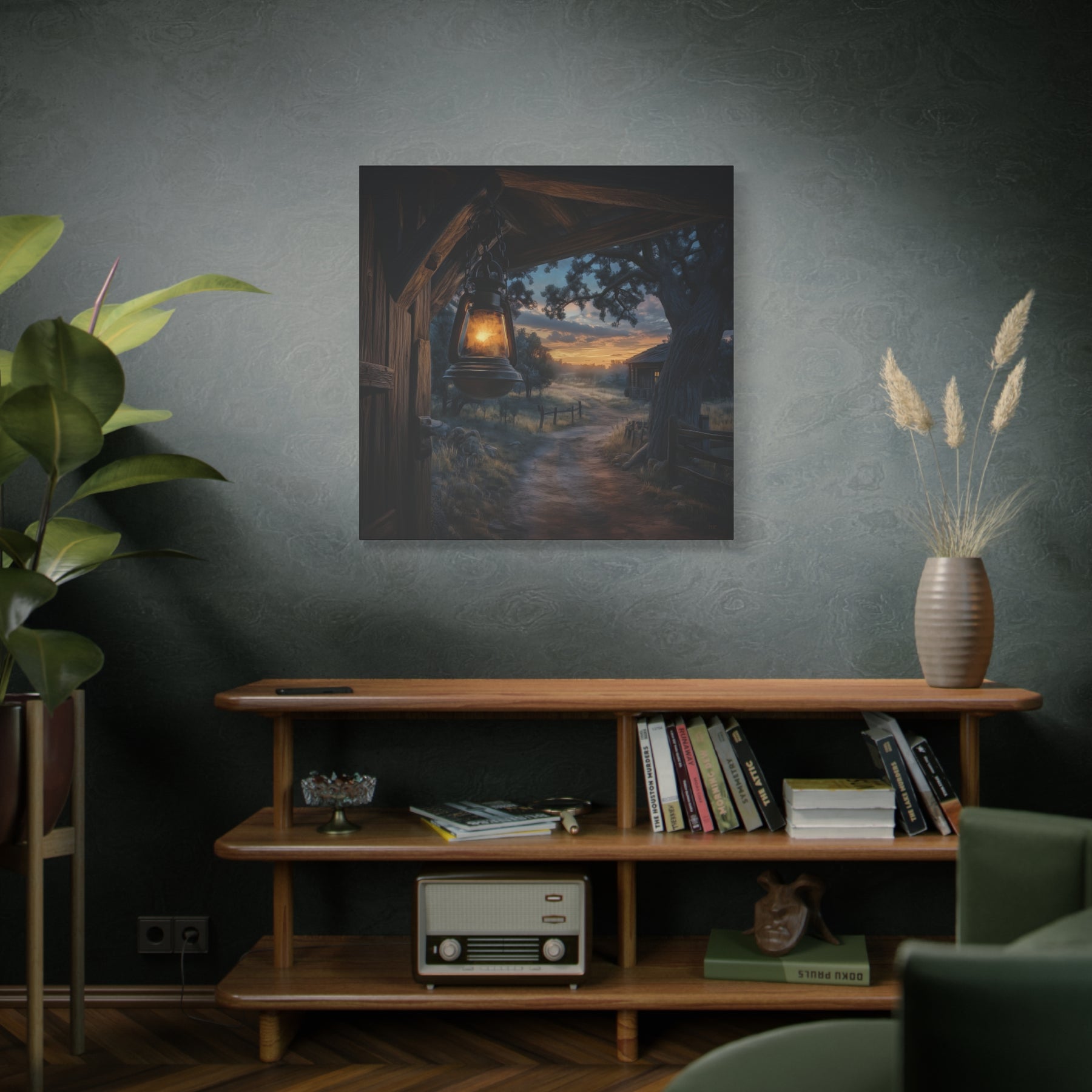 Golden light spills across the range, casting long shadows through the oaks and over weathered fences. A lantern glows on the porch. The trail leads home.
